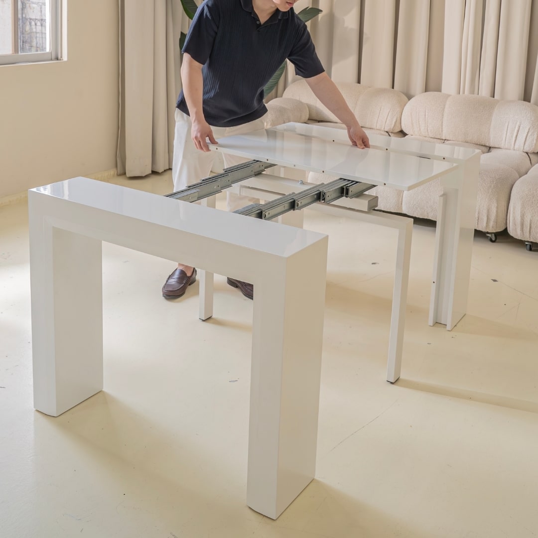 When fully extended, it can comfortably seat up to 12 people, measuring 273cm (~9ft) long and 95cm (~3ft) wide. while in its compact form, it is a console table that is only 47.6cm (~2ft) long.